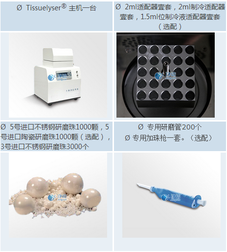 * 通常用于DNA和RNA分離的少量樣品可在一次性離心管中制備.可采用聚四氟乙烯材料制成的適配器,容納5或10個一次性樣品試管,進行細胞破碎.在多樣品組織研磨機中細胞組織在極短的時間內(nèi)得到快速而有效的破碎,因而無需額外的低溫制冷